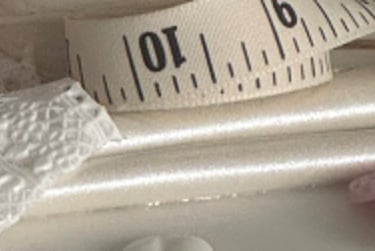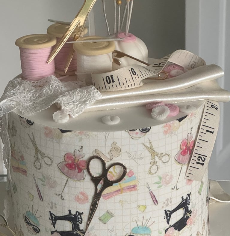 Hand made lace and edible fabric, along with handmade cotton reels to finish this cake.