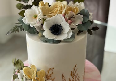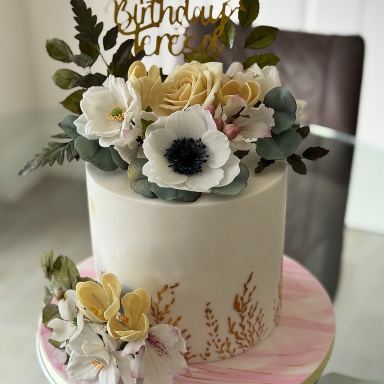 Prices start from £50.00 for a 6" round cake, that's approximately 5" tall. Vanilla-flavoured sponge, that's moist and light. Filled with jam and buttercream then covered in a white chocolate ganache and a thin layer of sugar paste.